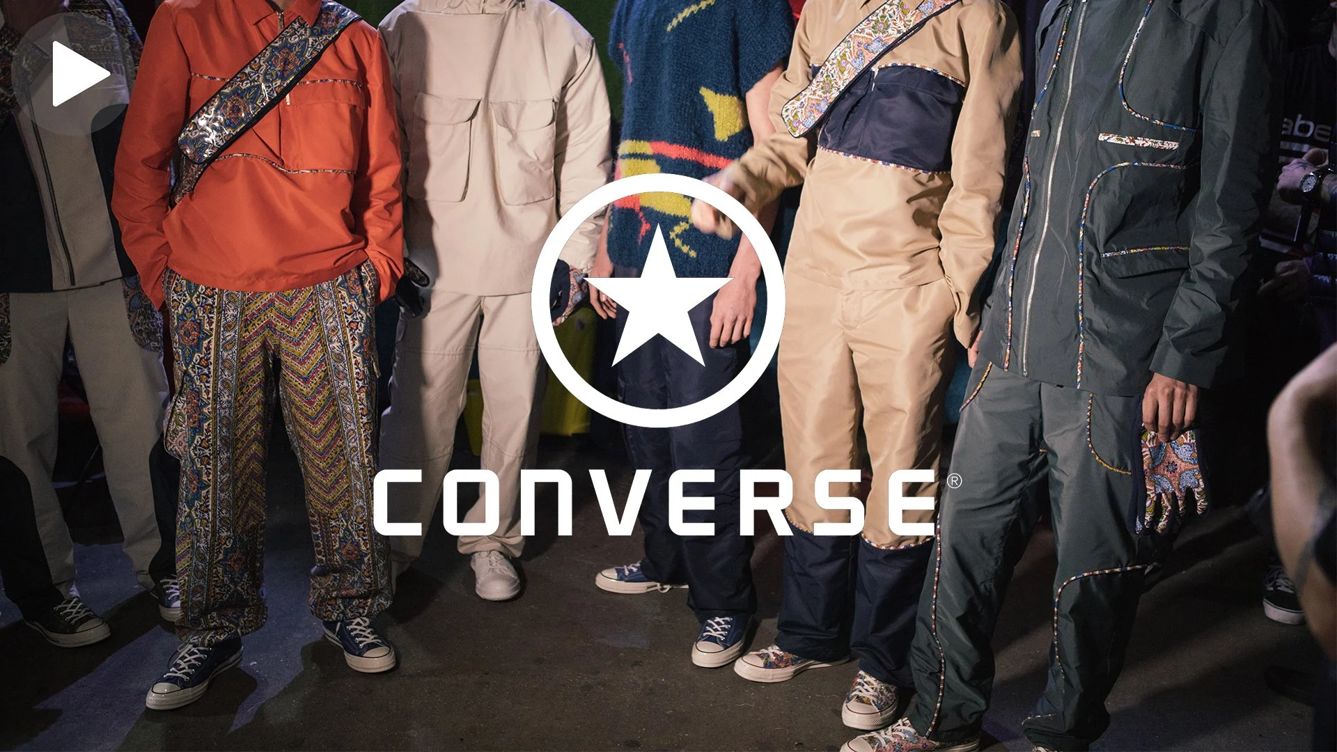Group of models wearing colorful Converse outfits, showcasing sneakers and streetwear with the Converse logo prominently displayed.