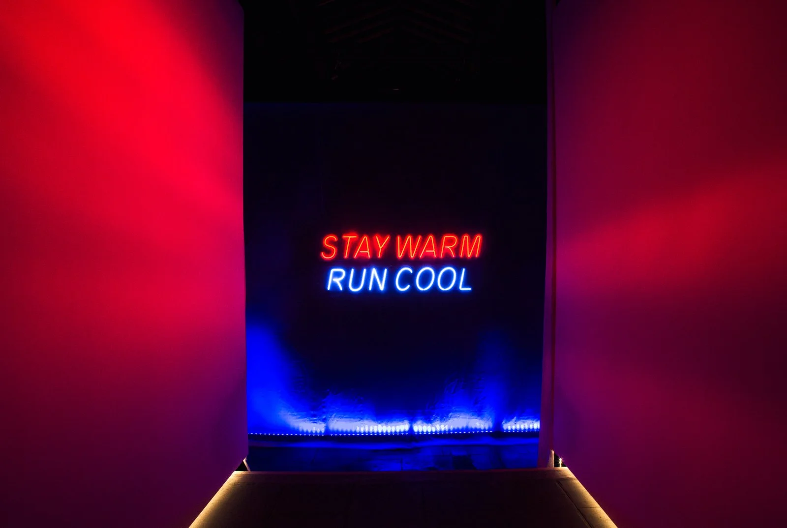 Neon sign with the text "Stay Warm Run Cool" in red and blue on a dark background.